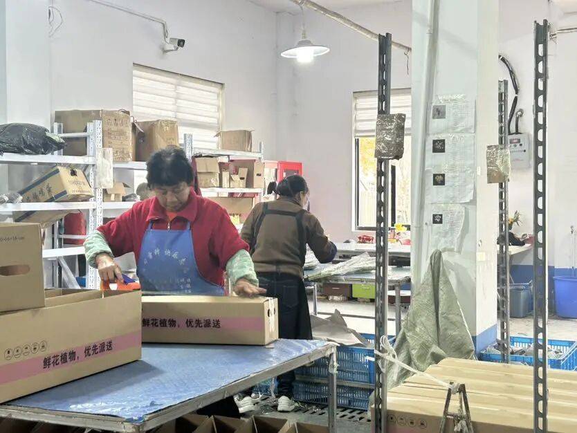 在金山卫镇八字村的一处鲜切花基地,水仙已萌出点点嫩芽,金桔果实累累压弯枝头,兰花静静绽放,北美冬青则缀满红艳艳的小果,处处洋溢着喜庆氛围。工人们正熟练地分拣、修枝、打包,将一箱箱鲜切花整理装箱,发往各地市场。